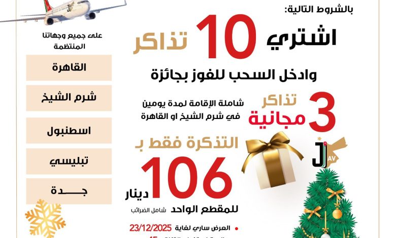 بمناسبة الأعياد ونهاية العام، أعلنت شركة الأردنية للطيران عن طرح 1000 تذكرة سفر للبيع المسبق ضمن عرض خاص وبشروط محددة.