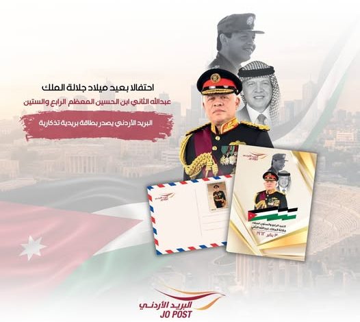 طرحت شركة البريد الأردني، بطاقة بريدية تذكارية خاصة بمناسبة عيد ميلاد جلالة الملك عبدالله الثاني الـ(64)، اعتبارا من يوم 29 كانون الثاني الحالي، وبقيمة 1.40 دينار للبطاقة الواحدة.